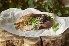 Husets sandwich bliver tilberedt af friskbagt surdejsbrød, vildurtesalat og kan vælges mellem varmrøget laks, rådyr, seranoskinke eller vegetar